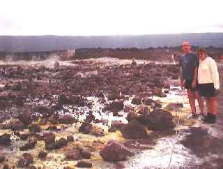 Phil and Pam at the sulphur banks. The ground was awash with yellow sulphur which you could certainly smell and there were many vents around us giving off fumes. They do warn you about the possible effects of breathing in the fumes, but everyone heads through to look down into a nearby crater all the same! |