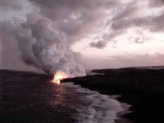 At last we reach the flow - and what a sight. Just to see this going on only 100m away from us was totally amazing and astounded us all (a bit like being on the nudy beach really). The very brightest point in this pic is where the lava is pouring out - as if from a tap. There was no lava visible on the slopes leading down to this point as it had all traveled underground through a lava tube. The two pictures below show the flow erupting a little more violently. There were a couple of blow outs bigger than these but trying to catch them on camera was tricky, better just to sit and watch (the binoculars came in handy for a close up view). |