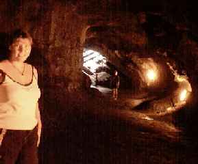Phil is standing in the middle of the tube so you can get an idea of the size of this thing. Tubes are formed when the ceiling and sides start cooling and harden, the remaining lava then drains away. Imagine it being filled with fast flowing red lava. This is the sort of tube that would be carrying the lava we saw on the previous day to the waters edge. |