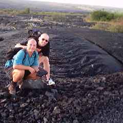 Phil and I stopped to have our picture taken next to this wrinkled up lava flow. We saw many like these alongside the bulldozed trail and the picture below left shows a close up. Below Pam is making her way along the trail. It was not an easy trail and we only managed to get our little car across the first two sections of lava - 4 wheel drive next time! Originally there was a road but recent eruptions have resulted in lava flowing across the road forcing it to close. |