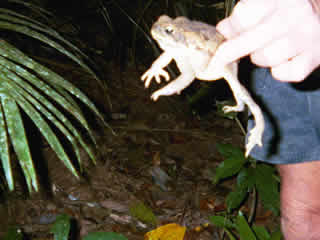 My first cane toad. Well my first live one anyhow, I saw lots of dried up skins! One of the activities on offer is a rain forest night trek. This was a good opportunity to see some of the nocturnal wildlife when the forest. really 'comes alive'. We were guided by a local chap who took us on a couple of set routes, with a torch in hand we got to see possums, bats, toads, snakes and best of all was the white lipped tree frog - if only that picture had come out better - amazing creatures to see close up. Oh and we also saw hunter spiders and other insects. Good trip. |