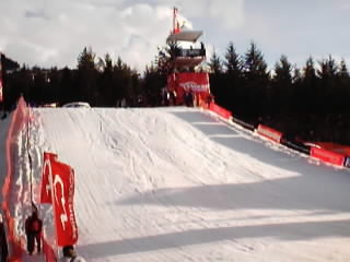 Ahhhhh the Big Air competition for snowboarders. Note there is no snowboarder in this picture! Because of where we were standing I could not get a very good shot of a boarder when they took off - the trees at the top kind of blended in with their dark clothing. Not that you would of seen them anyway, an optical zoom would be handy! At least you get an idea of the size of the jump. This is just the landing zone, the take off ramp you can just see peeking over at the lip of the hill and would be set some distance back. |