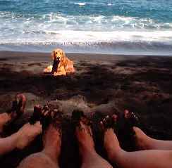 Eager to have a swim we found this gorgeous black sandy beach that we were told about. Lim (the manager) had mentioned that dolphins are often spotted playing off the beach and sure enough we were treated to this awesome sight. They jumped out of the water, spinning about, and came pretty close to some of the more adventurous people who swam out with snorkling gear to get a closer look. I reckon the dog here was eying up our wiggling toes and about ready to pounce on them. |