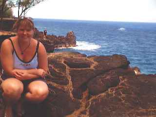 Further along we came across this coastline. Phil loved this bit. You can just see him standing to the right of Pams shoulder. Not content Phil bounded along the tops of the rocks to stand at the very end, right where the white water was. No doubt he had a big smile on his face, but he was too far away to see (I did take a picture though!). |