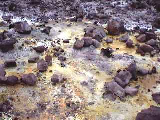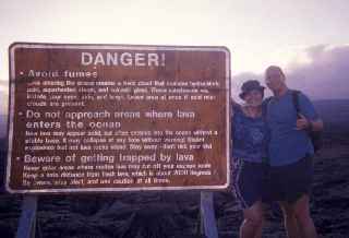 Phil and Pam at the sulphur banks. The ground was awash with yellow sulphur which you could certainly smell and there were many vents around us giving off fumes. They do warn you about the possible effects of breathing in the fumes, but everyone heads through to look down into a nearby crater all the same! |
