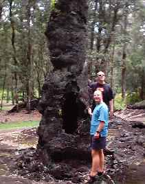 Day One Our first stop, just an hour or two after landing, was at the Lava Tree State Park. We were told that there was not much to see here but in fact it was an impressive drive through a forest full of large trees and a nice 20 minute walking trail around various lava trees. Phil and I are standing next to a pretty large lava tree, created when lava solidified around the tree and burnt out the inside leaving a hollow mold. Cool. |