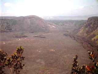 Day Two We went straight up to the Volcanoes National Park where you essentially drive about a set trail on Kilauea itself, stopping off at various points along the way. The route we took yesterday to the lava flow was not the usual route for tourists but one that only locals and residents are supposed to use (ooops, another state law broken). Looking at the Kilauea Iki crater, formed in 1959, you really do not get any idea of scale at all, but there are people walking down there among the steaming vents and it is is about 2 miles across! |