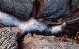 Phil is standing in the middle of the tube so you can get an idea of the size of this thing. Tubes are formed when the ceiling and sides start cooling and harden, the remaining lava then drains away. Imagine it being filled with fast flowing red lava. This is the sort of tube that would be carrying the lava we saw on the previous day to the waters edge. |