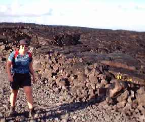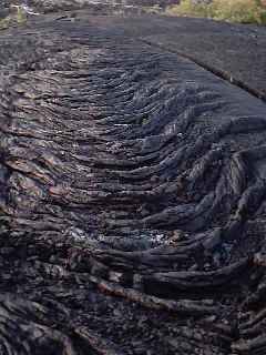 Phil and I stopped to have our picture taken next to this wrinkled up lava flow. We saw many like these alongside the bulldozed trail and the picture below left shows a close up. Below Pam is making her way along the trail. It was not an easy trail and we only managed to get our little car across the first two sections of lava - 4 wheel drive next time! Originally there was a road but recent eruptions have resulted in lava flowing across the road forcing it to close. |