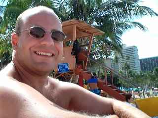 Phils gotten hold of my digital camera and taken a cool shot of me at my favourite spot on Waikiki beach, just next to the lifeguard hut. The life guards do get busy and I have seen several rescues take place, the funniest when one of the outrigger canoes was sinking with a load of tourists onboard (no one hurt - very shallow). They are forever giving out Band-Aids for cuts and grazes. |