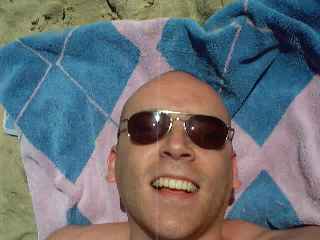 Still intrigued by the camera, Phil takes a great self portrait. Check out the funky colours of his beach towel and that cheeky glint in his eye through the sunnies. |