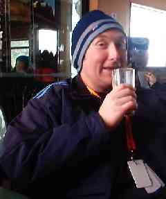 Dave quaffs a Cafe Latte from the up-market cafe, our only stop off point on Treble Cone. Actually the Hot Chocolates up here are pretty wicked. They use a chocolate sauce and pop a couple of marshmellows in too, best left for a minute or two and eaten when almost melted - my personal favourite. |
