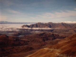Our first day boarding at Treble Cone. We were pretty much blown away by the view, this picture does it no justice at all, which overlooks Wanaka lake and had clouds hovering half-way up the mountains. In the lower right you may be able to make out a trail; this was the route that all the cars and buses take to get up here. |